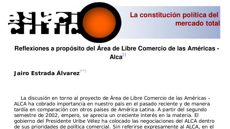 La discusión en torno al proyecto de Área de Libre Comercio de las Américas – ALCA ha cobrado importancia en nuestro país en el pasado reciente y de manera tardía en comparación con otros países de América Latina. A partir del segundo semestre de 2002, empero, se aprecia un creciente interés en la materia. El gobierno del Presidente Uribe Vélez ha colocado las negociaciones del ALCA dentro de sus prioridades de política comercial. Sin referirse expresamente al ALCA, en el plan de desarrollo "Hacia un Estado comunitario" se señala que como parte de su política comercial, "el Gobierno negociará acuerdos internacionales que eliminen barreras al acceso, estimulen la inversión extranjera y faciliten la reasignación de recursos hacia actividades más productivas". Y precisa que, junto al sector privado, se deberán "asumir los retos que suponen unas negociaciones complicadas sobre un temario amplio y ambicioso: servicios, inversiones, compras gubernamentales, derechos de propiedad intelectual, y normas para la regulación de la competencia".